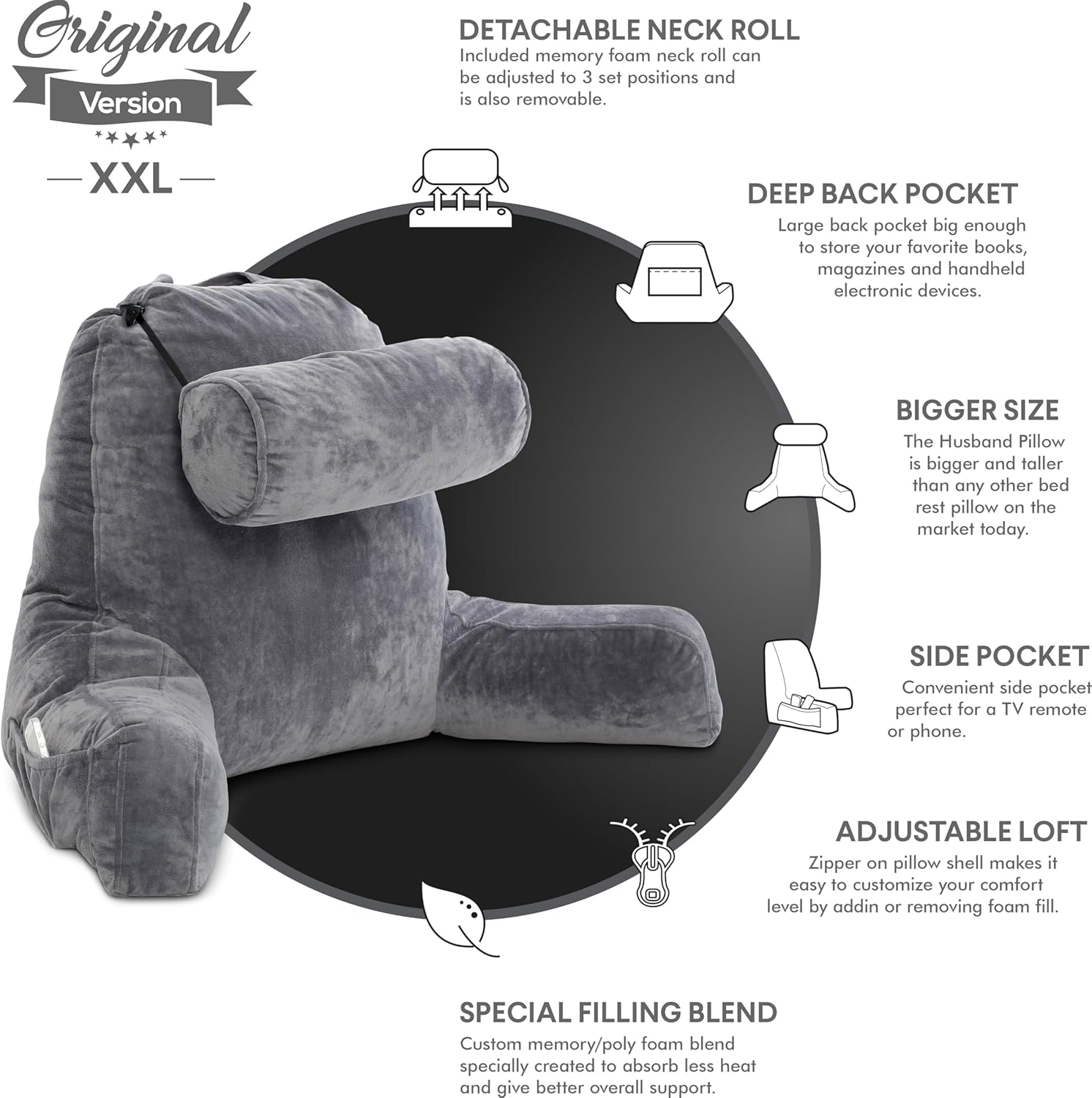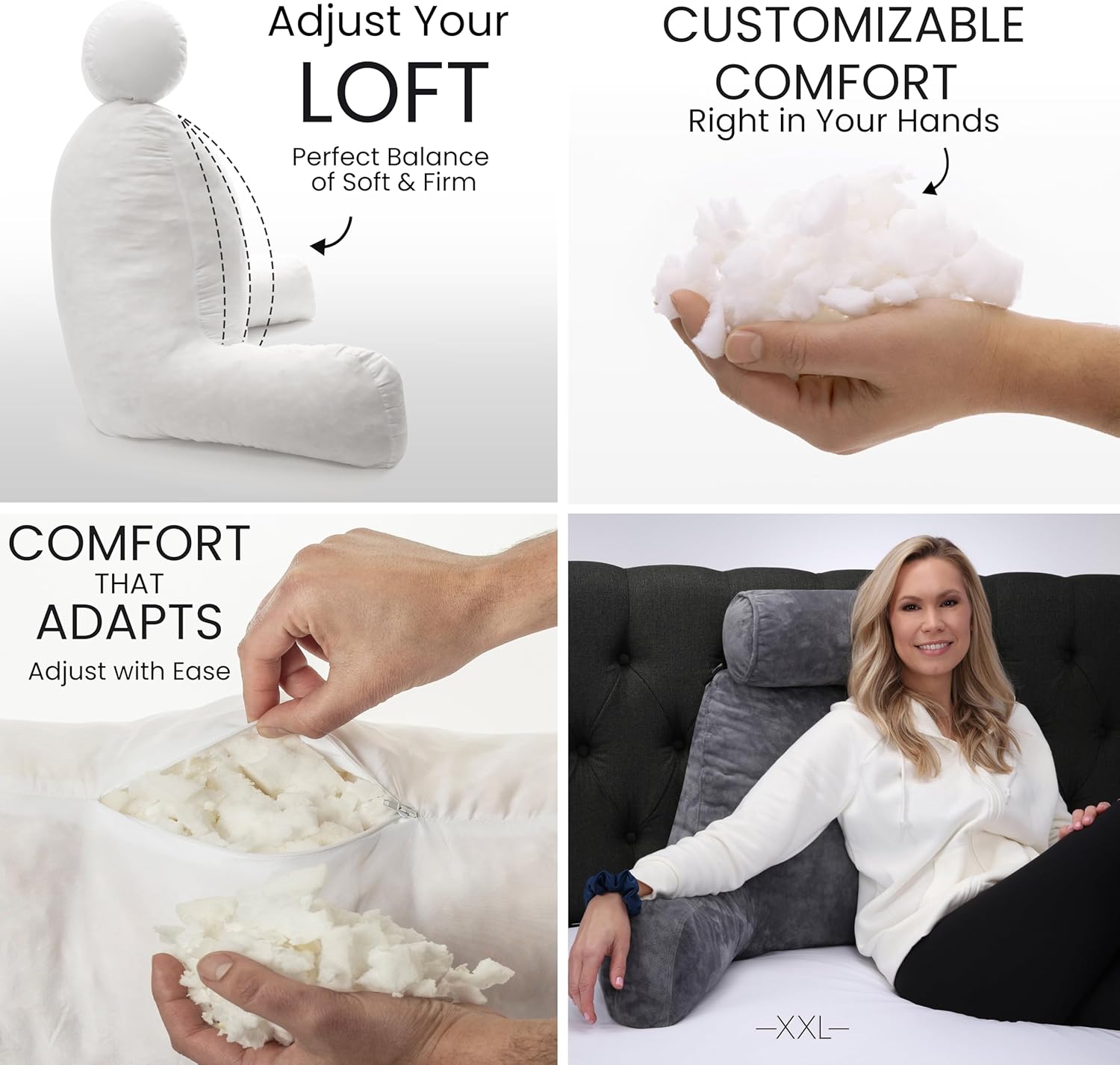Encourages better sitting posture by providing full back and arm support, prevents neck and shoulder strain, enhances relaxation time, and transforms your bed into a comfortable reading or working zone.